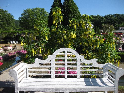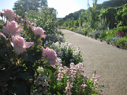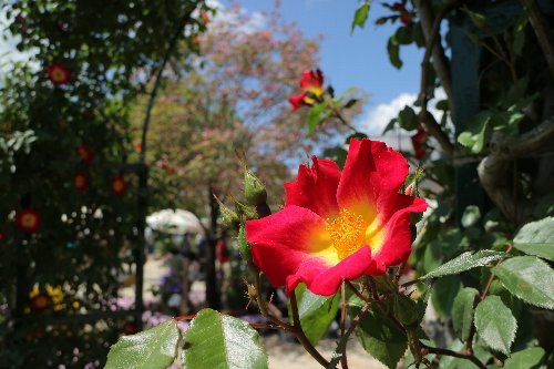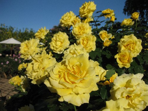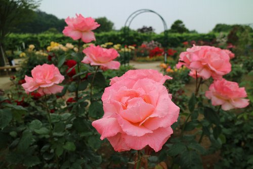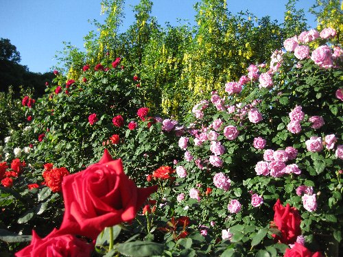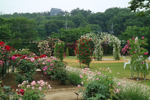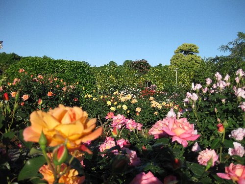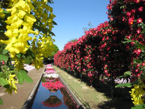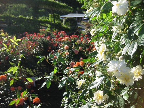 マロニエ亭前のバラ花壇からバラの咲く島を臨んで。遠くにキバナフジのトンネルが見えています。