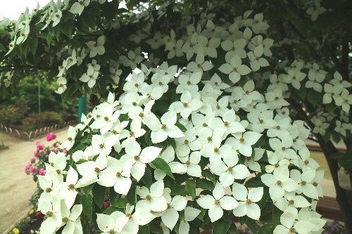 レストラン「ウェステリア」前にあるヤマボウシは、葉っぱが見えなくなる程に花を咲かせ、まるで花束の様です。