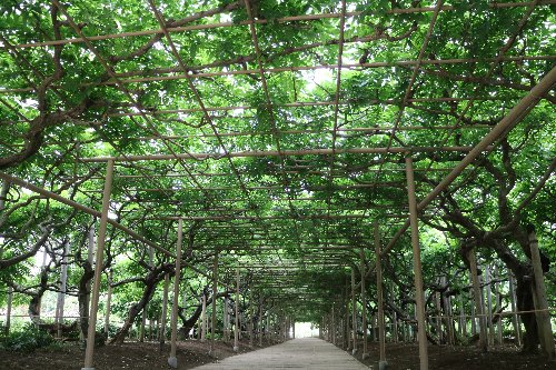陽射しが強く暑い日は、花がら摘みの終えた藤棚の下がおすすめです。
