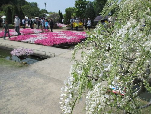 白藤トンネルは、25本の庭木仕立ての藤を左右に配して作られているので、トンネルの外からの眺めも綺麗なんですよ♪