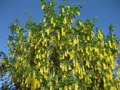 今日は朝から洗われたかのような美しい青空の一日となりました。まさに五月晴れ、少し汗ばむほどですf(^▽^;雲一つない青空に満開のキバナフジが映えております♪