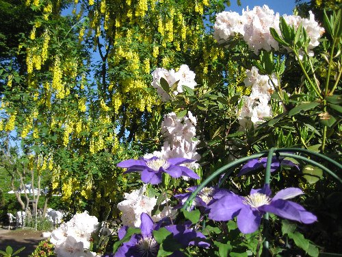 白藤トンネル南側園路、クレマチスとシャクナゲの小径、