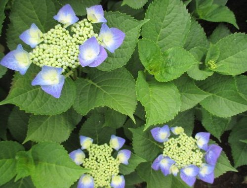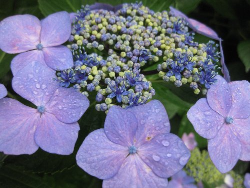 よく言われていることですがアジサイの花びらのように見えている部分は蕚です。本当の花は真ん中の小さな青い星の所☆ちなみにガクアジサイのガクって「蕚」ではなく「額」の方!小さな花の額縁のように咲くことからなんですよ(^^)