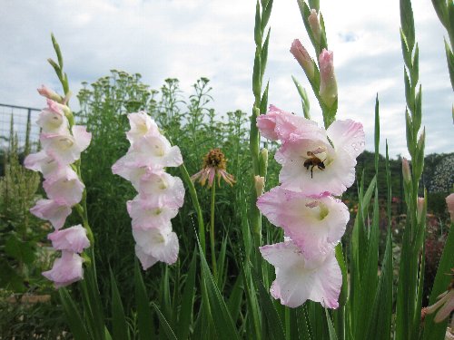 グラジオラス 花がすみ 淡い桃色が優しい気持ちにさせてくれます~あ、蜂さん!