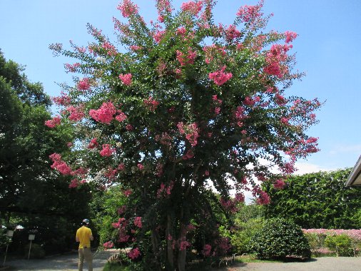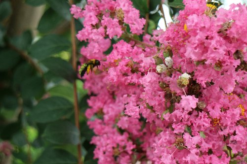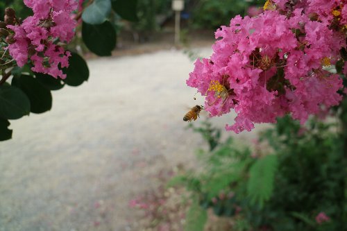こちらはサルスベリの花粉を後ろ脚にせっせと集めるセイヨウミツバチ。働き者ですね。
