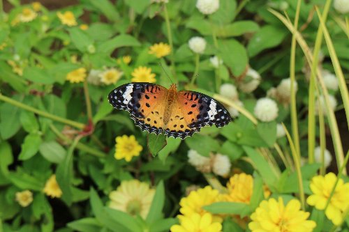 こちらは、黄色いジニアの蜜を吸いに来た、ツマグロヒョウモン ♀