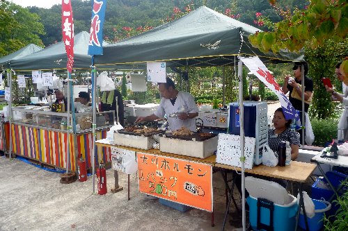 こちらは食!ホルモンの焼けるいい匂いがあたりに漂います。先ほどのビールと相性抜群なはず!