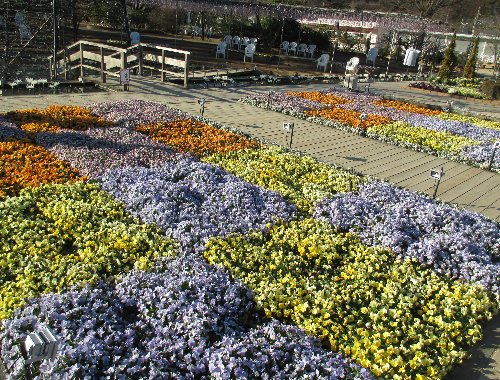 ショッピングハウスを出てすぐ目の前、メタセコイヤの木の下はビオラと葉牡丹のはめ込みハート花壇♪