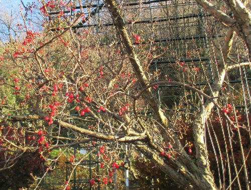 サンシュユの実も熟したらしく、鳥達につつかれ始めているそうです。