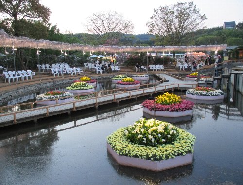 そんな園内を、新しい藤棚を建設中の山の上から見てみました。