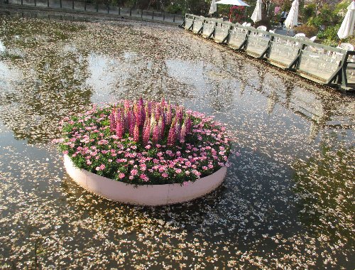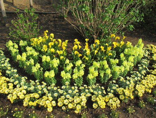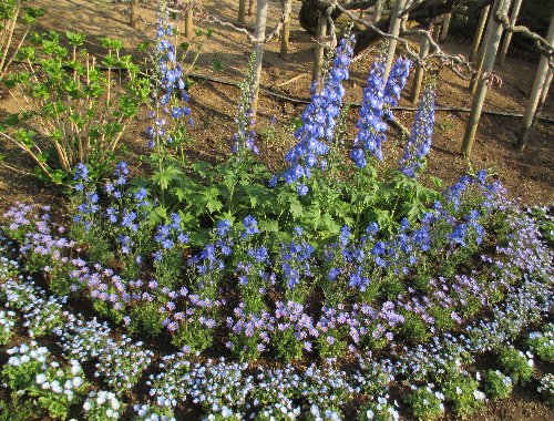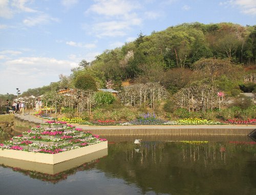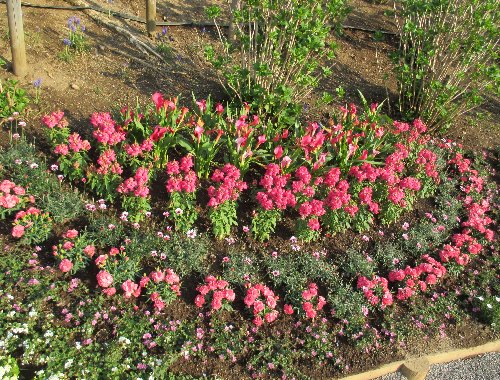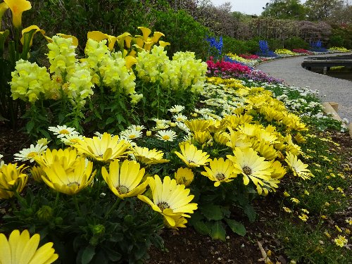 園内の花壇もすっかり春色に模様替えしました。こちらはペチュニアのピラミッドがある池沿いの花壇です。黄色・ピンク・青の花々がそれぞれ際立つおすすめ花壇のひとつです♪