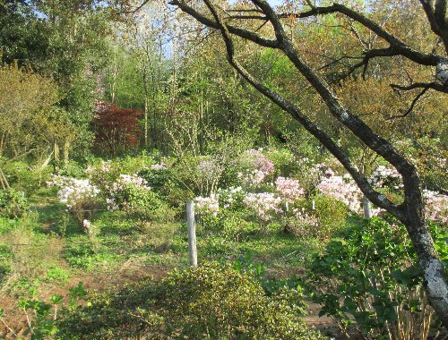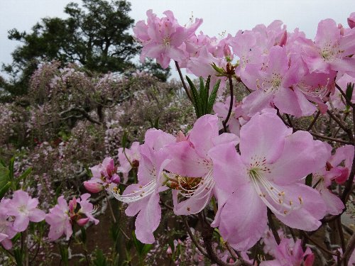 クロフネツツジと一緒に…こちらは園内の山側にて。淡いピンクと一言で表現することも出来ますが、それぞれの植物によっても色味が違うのが面白い所です。さくら色のグラデーションをお楽しみ下さい♪