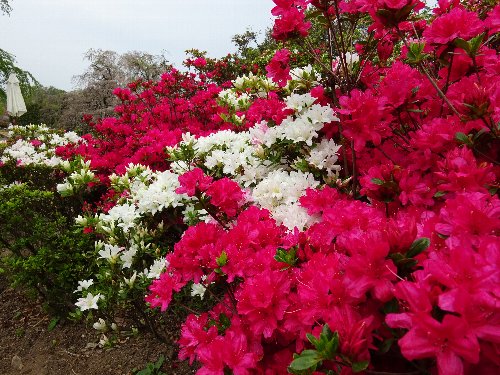 ツツジも咲き始めてきました。こちらは園内の中央付近にあるツツジの丘というエリア。園内には5,000本以上のツツジがありますが、ここではその色とりどりのツツジがこんもりと丘のように植栽されています。すぐ隣には大藤棚があるので、大藤が咲いた時にはここのツツジとの美しい共演がお楽しみいただけますよ!