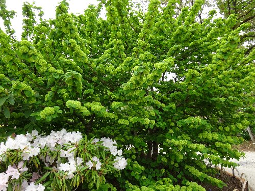 まりもがもこもこくっついたようなこの木は…オオデマリです!!咲き始めは黄緑色で、これから白色に変わっていきます。アジサイに似ていますが、スイカズラ科で別の植物です。白い花の時のオオデマリも綺麗ですが、黄緑色の今の状態も爽やかで素敵だなと思います。