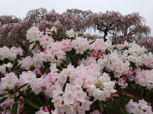 さくら色の藤とシャクナゲ…この共演を楽しめるのは半月池周辺となっております。