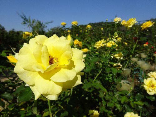 秋バラも見頃を迎え始めてきました。8月末から9月頭にかけて夏剪定を行い、10月10日頃からいっせいに咲くように調整しています。それでも品種ごとに咲くタイミングが違うので…こちらはやや早咲きのゴールドバニ―。