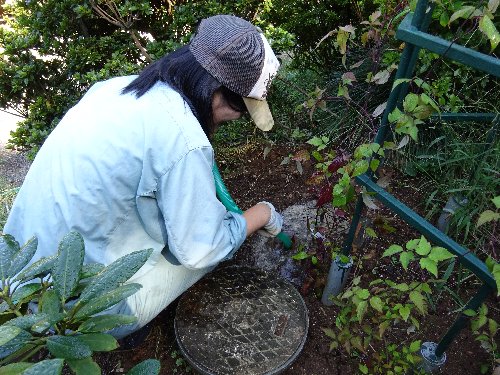 今日のしまちゃん、補植したクレマチスに水をあげてます!