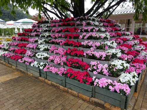 園内に入ってすぐの大きな木、メタセコイヤの木の下には今年アザレアが登場です!大きなツツジのような花で華やかさがあるのですが、寒さには弱いので霜が降りるまでとなります。