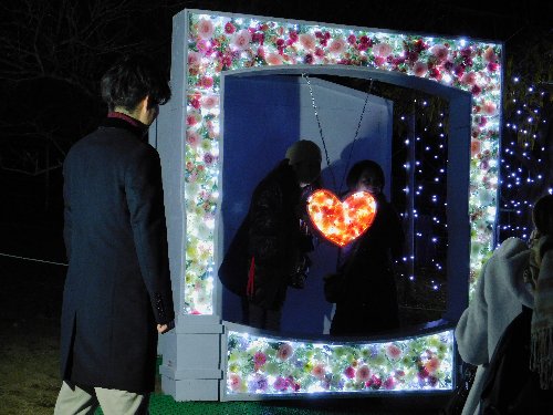 可愛らしいハートがモチーフのスポットです。周りには色鮮やかな造花が彩られています。