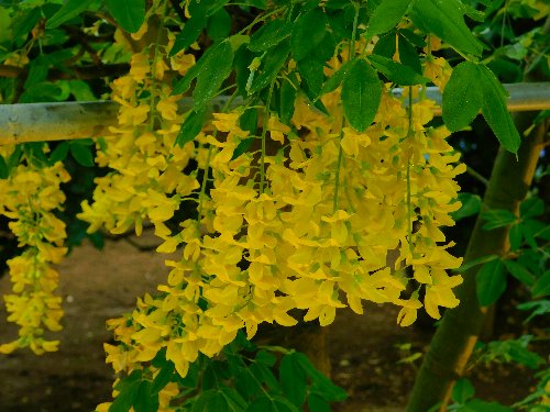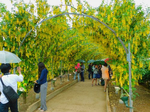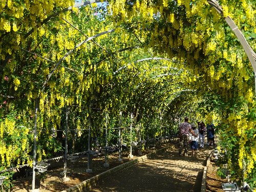 きばな藤のトンネルです。満開を迎えたきばな藤、朝日に照らされまばゆいばかりの黄金色のトンネルになりました。