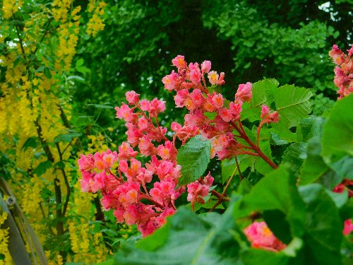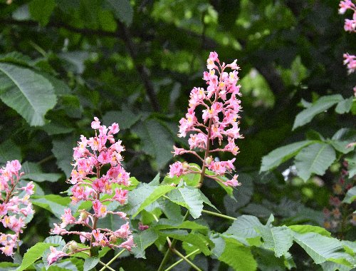 ベニバナトチノキ。可愛らしい赤い花が天に向かって伸びていきます。