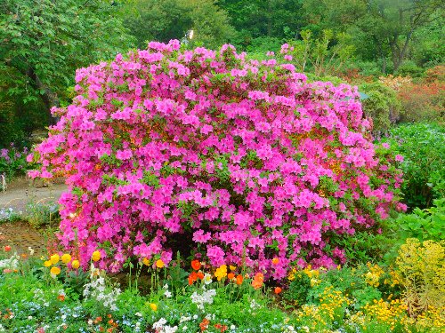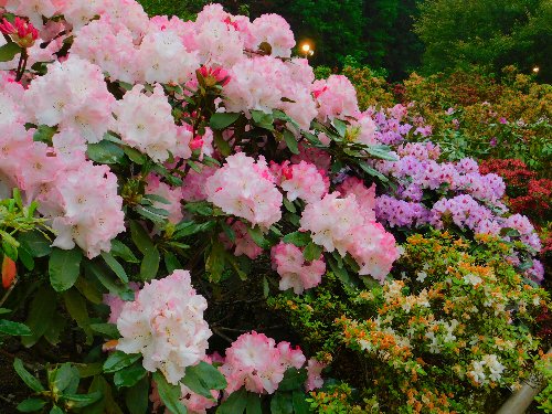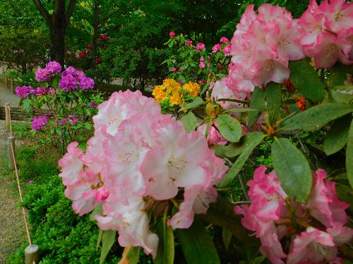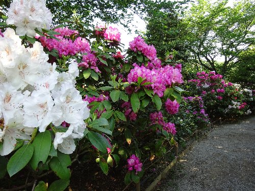 中咲きのシャクナゲが見頃を迎え、シャクナゲの森・シャクナゲの小路は一年で最も色に溢れた華やかな場所となっています。