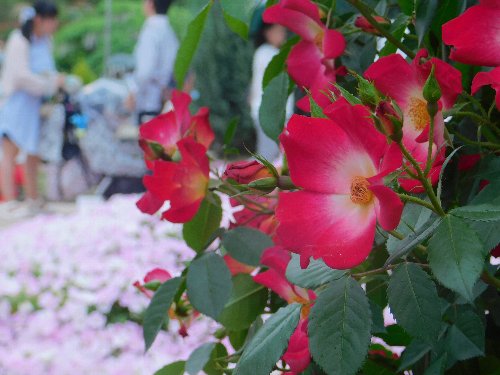 フラワーステージでは一重咲きの赤いつるバラ「カクテル」が見頃です。バラ栽培初心者の方にもおすすめの品種です!