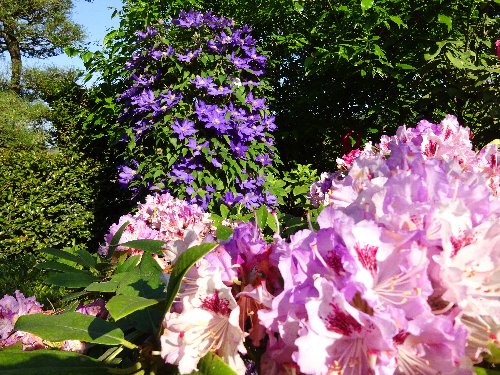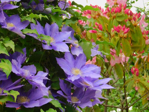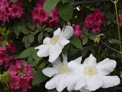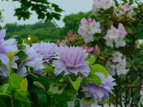 ローズガーデンから移動し、西ゲート付近シャクナゲの小路よりクレマチス「マダム バンホーテ」と赤いシャクナゲの共演!!