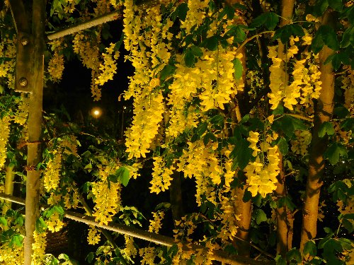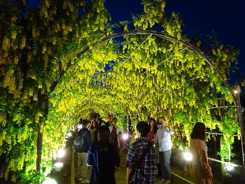 きばな藤のトンネル。きばな藤は青空にも映えますが、暗闇だと黄色の花房とのコントラストでより美しく見えます。
