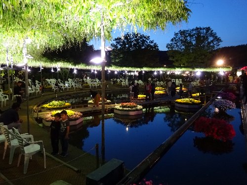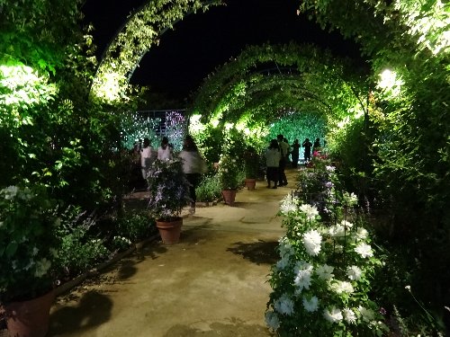 フラワーステージのカクテルのアーチ。ライトアップされた夜は一段と美しいです。