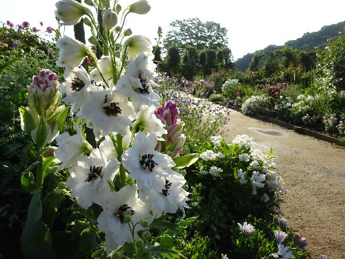 デルフィニウム「ブラック アイ エンジェルス」。ローズガーデンに黒い瞳の天使が舞い降りました。