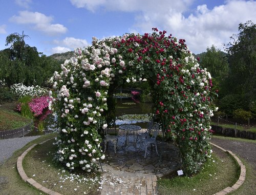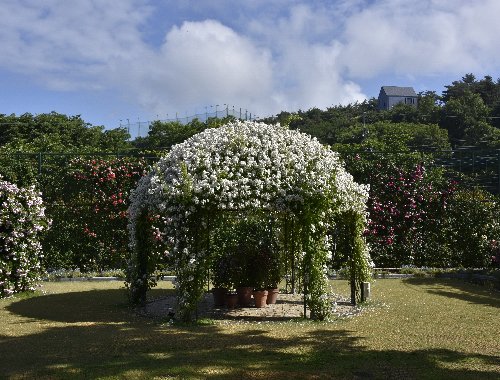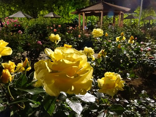 歩き疲れたらバラを眺めながらガゼボ(東屋)で一休み出来ますよ。