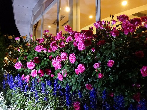 レストラン「ウェステリア」周りのバラも美しくライトアップされています。店内からはバラを間近に感じながらお食事が楽しめますよ♪