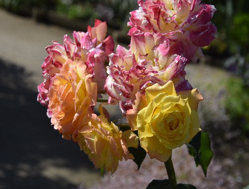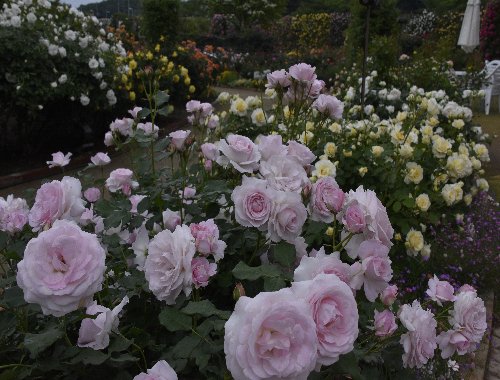 レストラン「ウェステリア」の周りのバラは建物が風除けとなり、一足早く見頃を迎えました。絞りが美しいバラ「きらり」が皆様をお出迎えいたします。