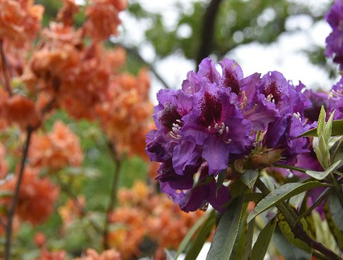 紫色のシャクナゲとオレンジ色のエクスバリーアザレア。