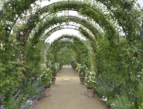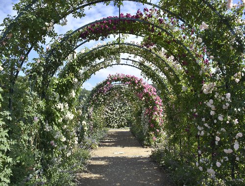 ローズガーデン中央には「バラの回廊」が。香り高いオールドローズを中心に、