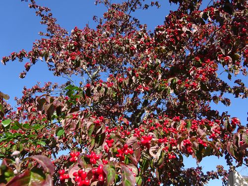 ハナミズキのたわわに実った赤い実、赤く色づいた葉も美しいです。