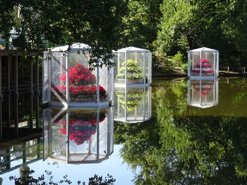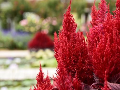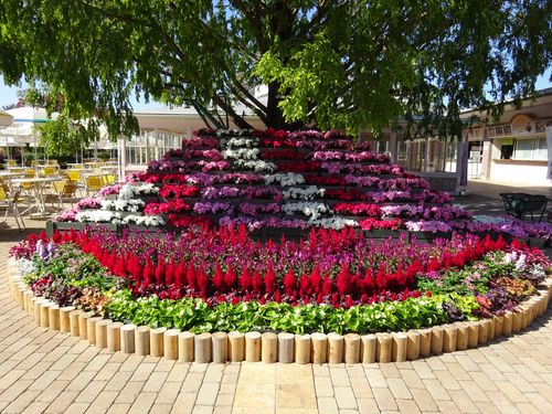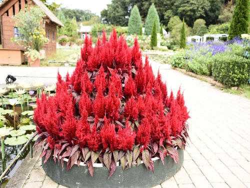 メインハウスを出てすぐに写真スポットが!手前はもこもこが可愛いケイトウというお花。奥のピラミッド部分はフリルが豪華なアザレアというお花です。
