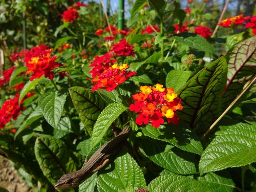 アメジストセージの足元には白いランタナが植えられていますが、ローズガーデンではこんな色鮮やかな品種もあります。おや、トカゲ?