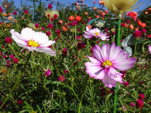コスモスもまだまだ綺麗です。よくお問い合わせいただく、草丈の低いコスモスにするには?ですが①矮性品種の種を蒔く➁夏に種を蒔く③矮化剤を利用する、などがあります。おうちのコスモスが大きくなって困るという方は、一度試されてはいかがでしょう。
