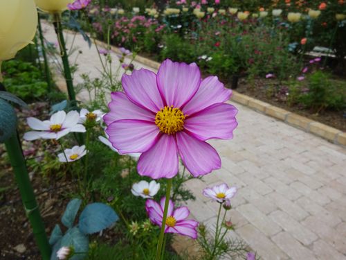 少し変わったコスモス…覆輪や絞り模様の入るピコティという品種。単色もいいですが面白みがあります。