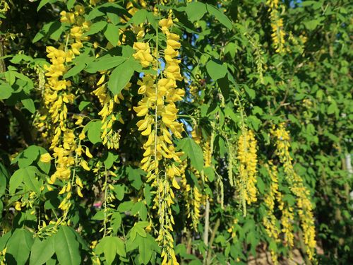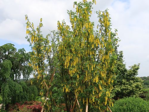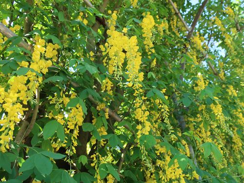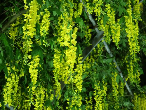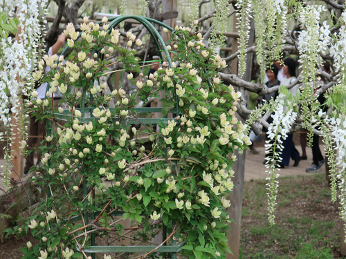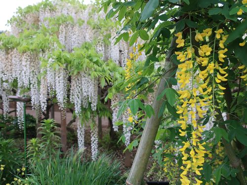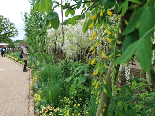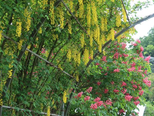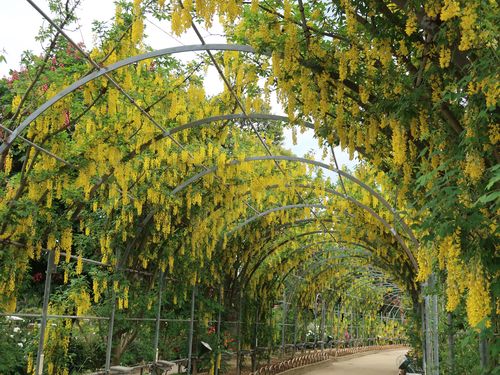 眩い光が降り注ぐキバナフジのトンネル。他にもアーチ仕立てのものが何カ所かあります。ベニバナトチノキと一緒のこちらはオリジナルショップ1号店のそばです。