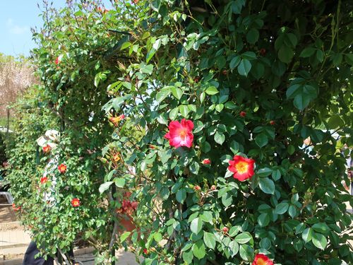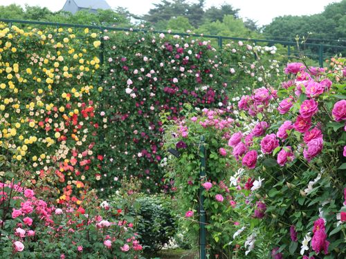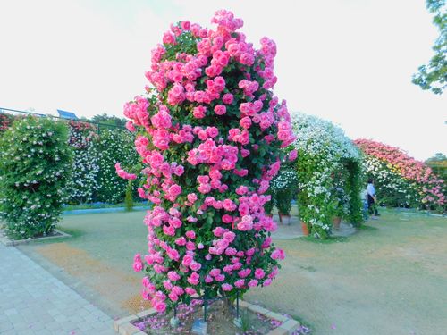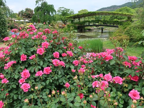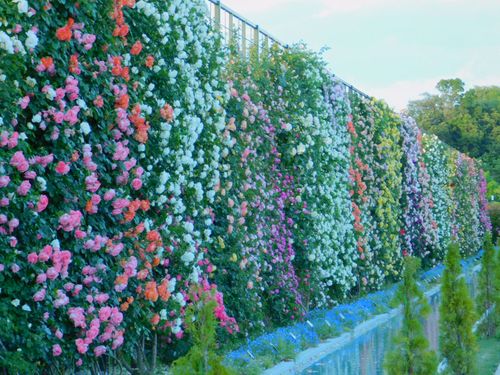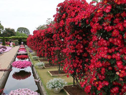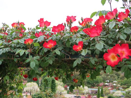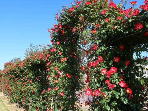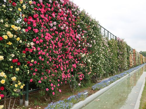 さてこちらはローズガーデン。バラの壁画が見頃を迎えました。高さ4m、幅120mのバラの壁画。実は6mで1枚の絵になるよう誘引されています。