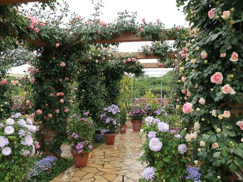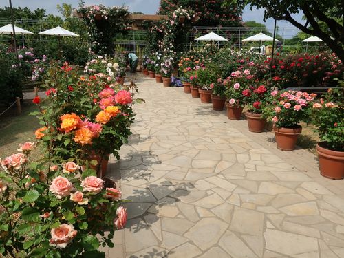 うす紅橋を渡った先、バラの咲く島ではたくさんのバラの鉢がお出迎えしてくれています。