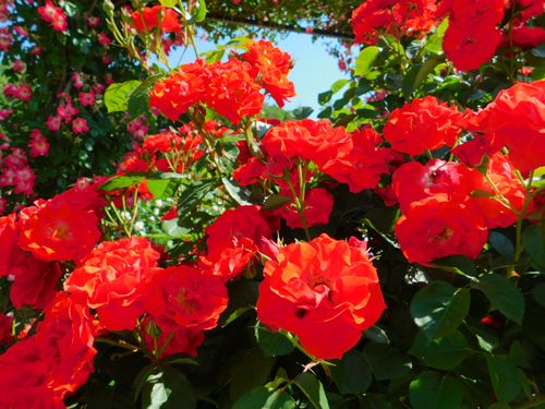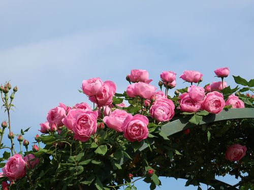 同じくフラワーステージにはスパニッシュビューティーという一季咲きのつるバラのアーチがあります。一面ピンク色の甘い雰囲気です。