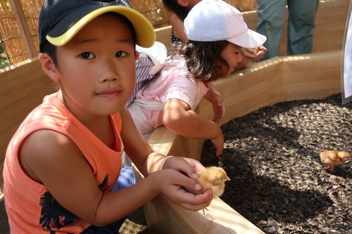 可愛らしいヒヨコと触れ合う事もできます。優しく触ってくれてありがとう。