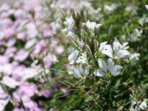 クレオメはアメリカ原産の一年草で、風に蝶が舞うような花姿から別名セイヨウフウチョウソウと呼ばれています。