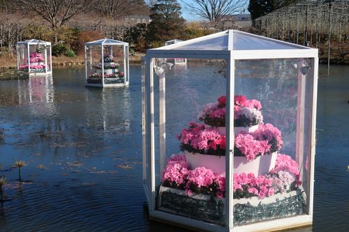 水上のフラワーハウスにはアザレアやマーガレットが春を思わせるように咲いています。