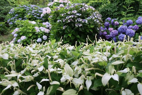 こちらはアジサイとハンゲショウの共演です。花の咲く頃に葉の一部分が白くなることから半化粧と呼ぶ説もあるそうです。