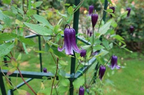 上品な花といえばクレマチス!青紫色の花はロウグチ。淡い藤色の花はベティーコーニング。クレマチスには珍しく甘い香りがあるんですよ!